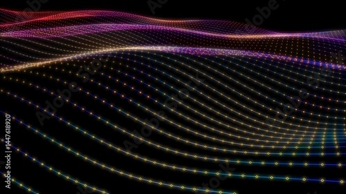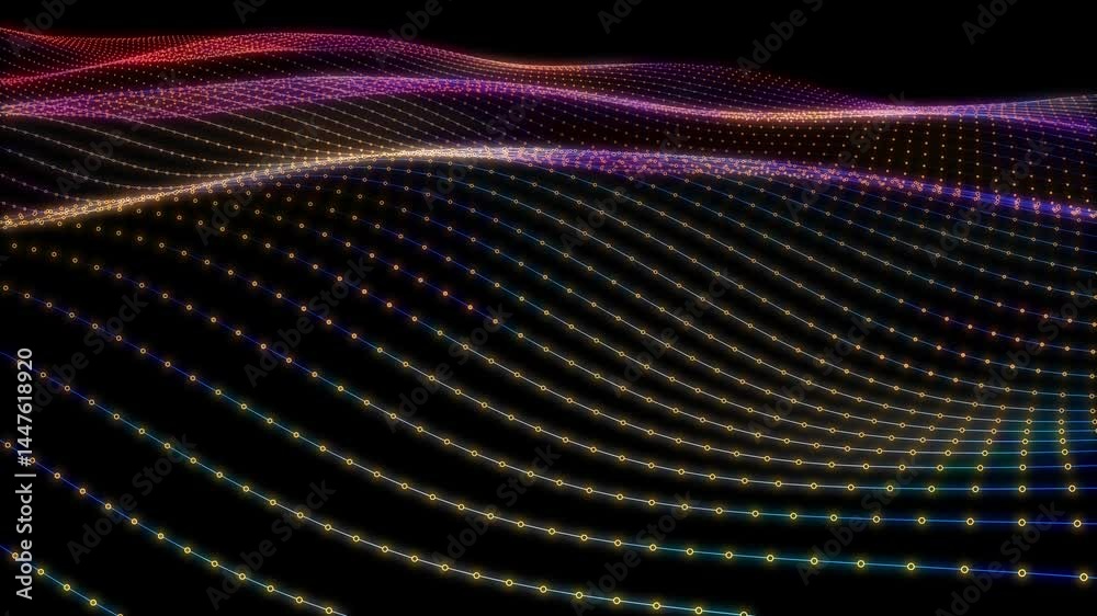 Wall mural abstract array lines on surface connected circles in dynamic wave animation. wireframe of lines conn