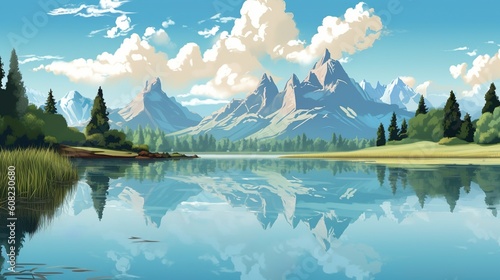 Wall mural abstract background mountains with lake. illustration of a serene landscape of mountains and a seren
