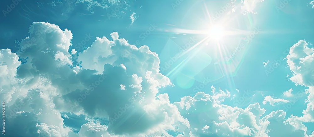 Wall mural : Abstract background showing a sunny blue sky with fluffy white clouds and light flare ideal for addi