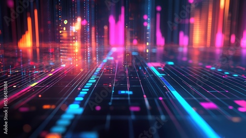 The watermark will not be included on Wall mural.: Abstract background showing an illuminated grid with pink and blue vertical lights above it