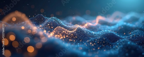 Abstract background with blue wavy particle flow, bokeh and orange glowing lines - modern data tech, Wall mural
