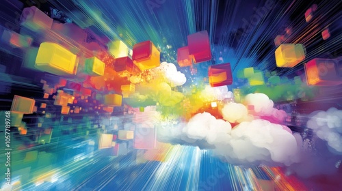 Wall mural abstract background with colorful cubes floating in a sky with clouds. - Wall murals Wall mural abstract background with colorful cubes floating in a sky with clouds. - Wall murals