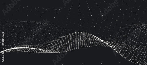 Wall mural : Abstract background with dynamic black and white wave - futuristic dotted wave of bright particles on