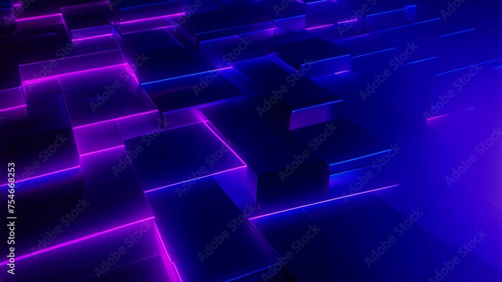Wall mural abstract background with glowing squares in blue and violet colors. 3d rendering, futuristic sci-fi