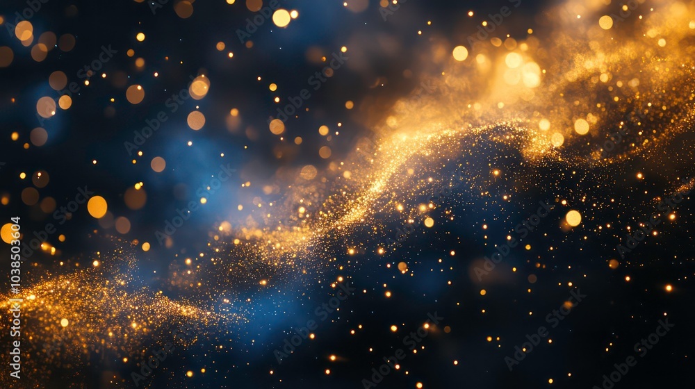 Wall mural abstract background with golden particles and blue bokeh lights on a dark background.