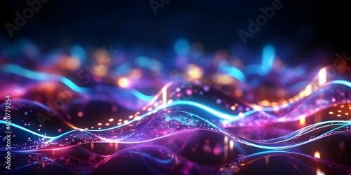 Wall mural : Abstract background with pink blue glowing neon lines and bokeh lights - data transfer concept - digit