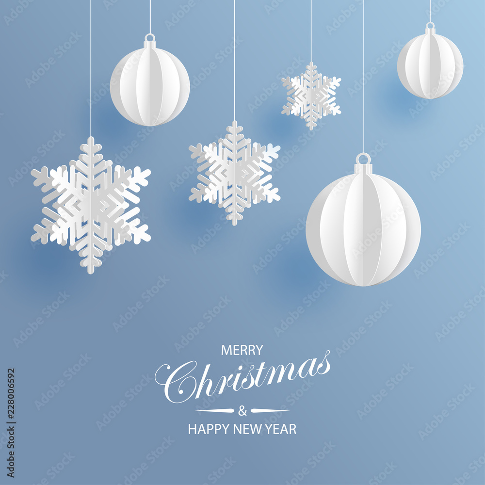 Wall mural abstract background with volumetric paper snowflakes and christmas ball. white 3d snowflakes and dec