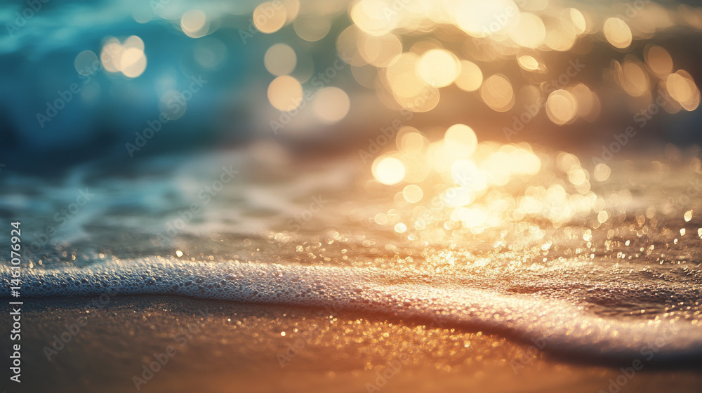 The watermark will not be included on Wall mural.: Abstract beach scene with blurred bokeh effect, capturing shimmering waves and soft foam on sand, ev