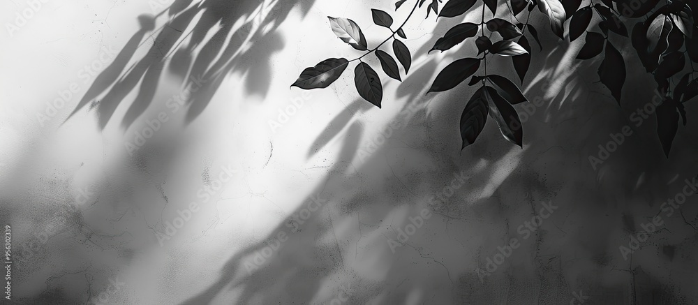 The watermark will not be included on Wall mural.: Abstract black and white background of leaf shadows on a concrete wall with empty copy space image