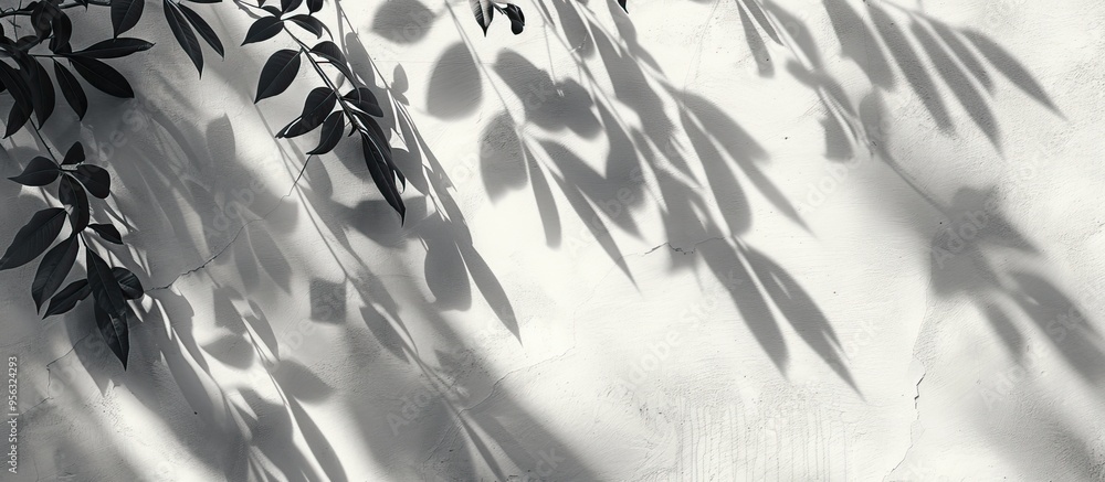 The watermark will not be included on Wall mural.: Abstract black and white background of leaf shadows on a concrete wall with empty copy space image