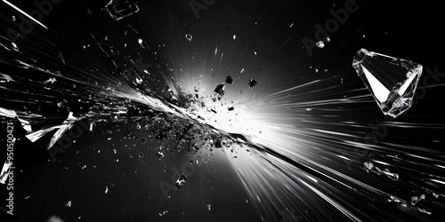 Wall mural abstract black and white image of metal shards exploding on a dark background, artwork of metallic f