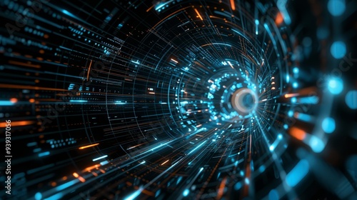 Wall mural : Abstract black background with dynamic blue lines and geometric shapes representing technological ad