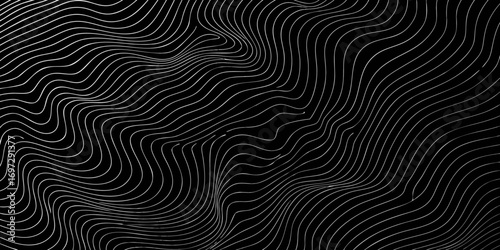 Wall mural : Abstract black background with flowing white wavy lines creating a topographic map effect