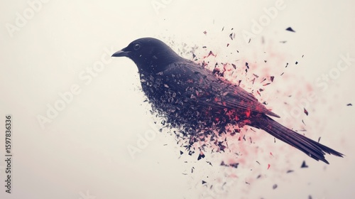 Wall mural abstract black bird disintegrating into red and black particles against a white background.