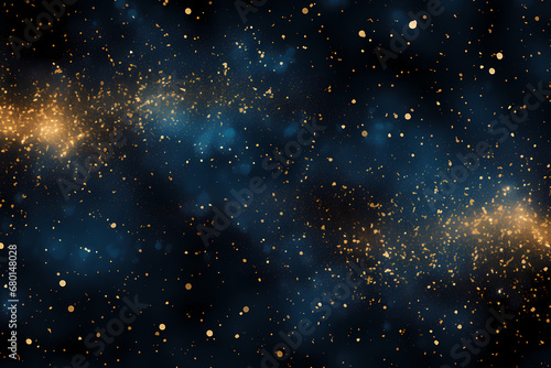 Wall mural abstract blue and gold background with particles. golden light sparkle and star shape on dark endles