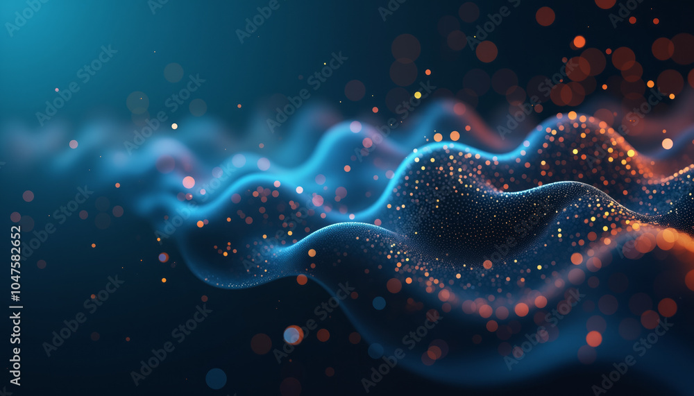 Wall mural : Abstract blue and orange background with wavy lines and dots, ideal for dynamic digital flow and con