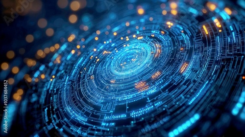 Wall mural abstract blue and orange glowing circular tech pattern with bokeh effect.