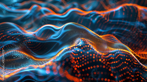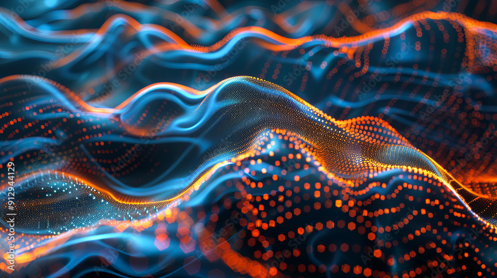 Wall mural abstract blue and orange wavy digital particles background big data visualization network connection - Wall murals Wall mural abstract blue and orange wavy digital particles background big data visualization network connection - Wall murals