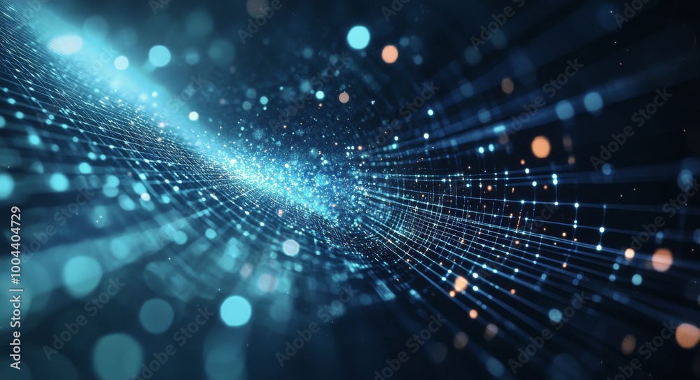 Wall mural : Abstract blue and teal particles floating in a dark setting with glowing effects