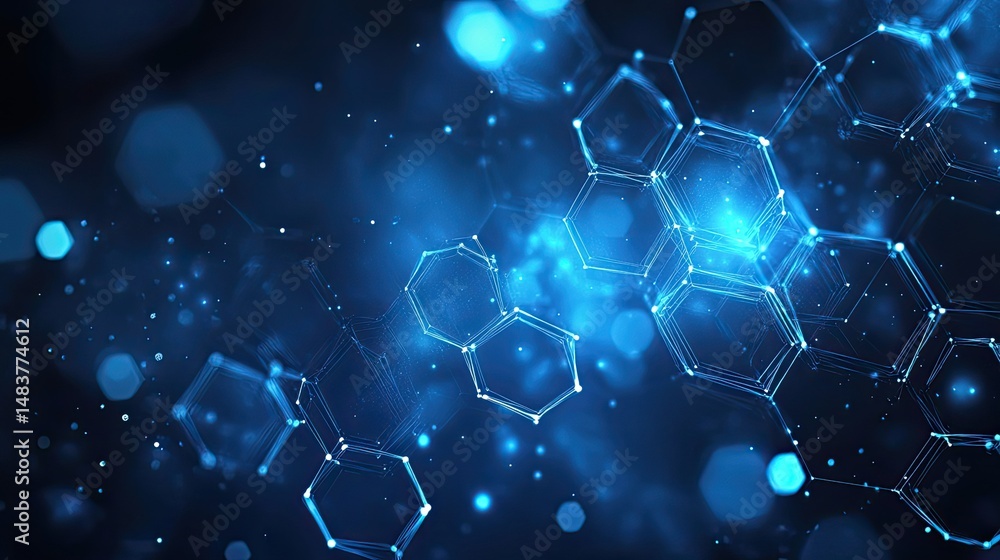 The watermark will not be included on Wall mural.: Abstract blue background featuring interconnected hexagon shapes with glowing light points