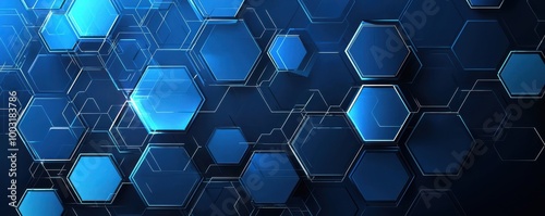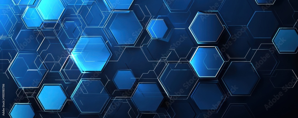 Wall mural : Abstract blue background with interconnected light lines and glowing hexagons creating a futuristic