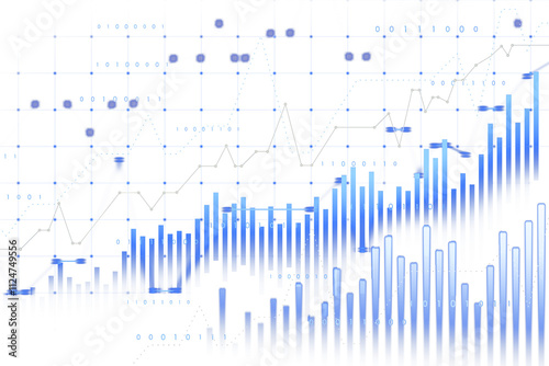 Wall mural : Abstract blue bar and line graph with binary code on a white background, grid layout, digital design