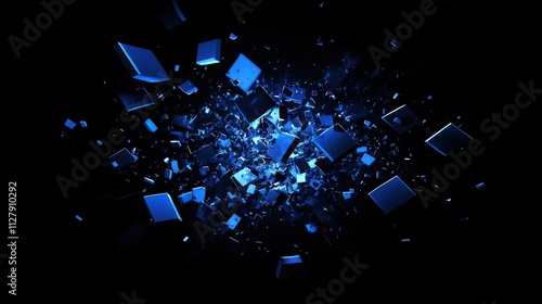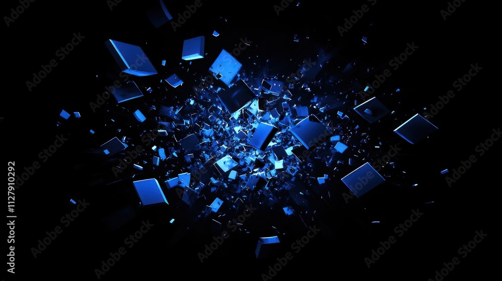 Wall mural abstract blue cubes exploding in dark space. - Wall murals Wall mural abstract blue cubes exploding in dark space. - Wall murals