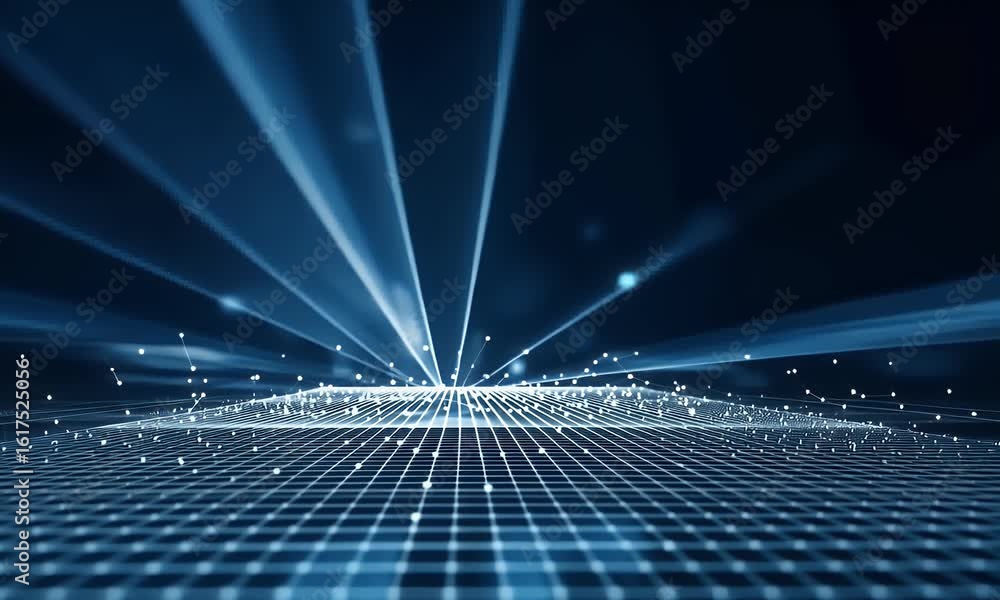 Wall mural abstract blue digital grid background with glowing light rays and mesh. digital technology concept f - Wall murals Wall mural abstract blue digital grid background with glowing light rays and mesh. digital technology concept f - Wall murals