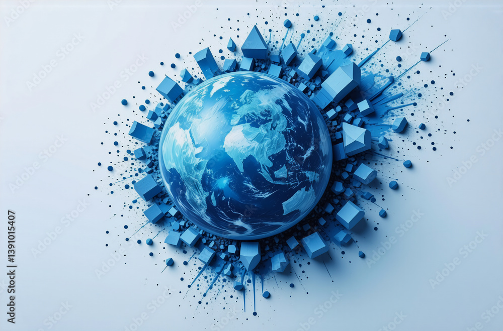 The watermark will not be included on Wall mural.: Abstract blue globe surrounded by geometric shapes exploding outwards, creating a dynamic and modern