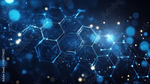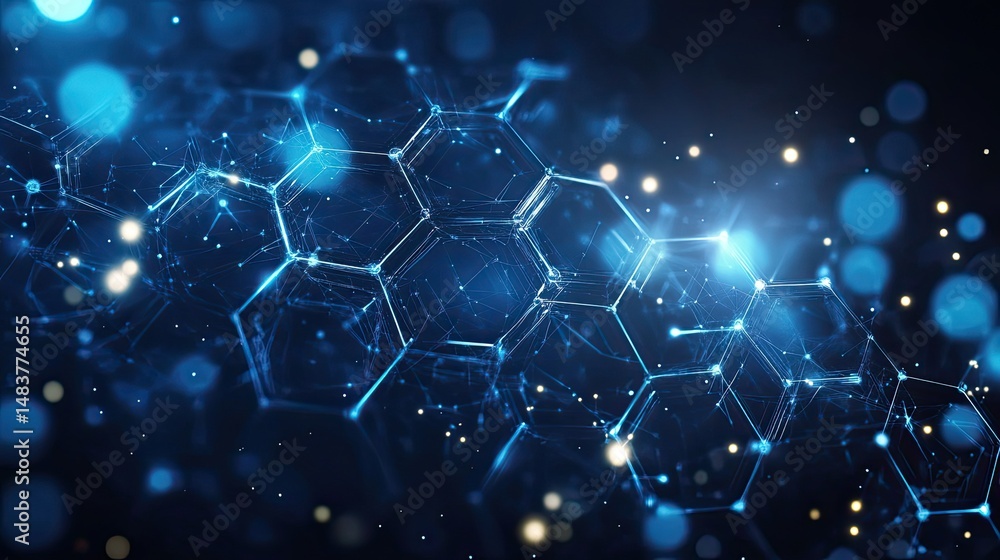 Abstract blue glowing hexagon network with connecting lines and bokeh lights in the backgroundWall mural