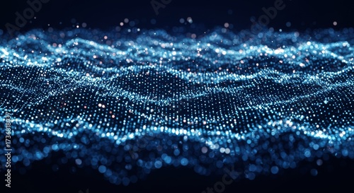 Wall mural : Abstract blue particle wave - dynamic flowing digital landscape with sparkling highlights -