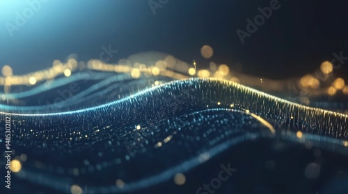 Wall mural abstract blue wave data background, dynamic particle stream illustrati