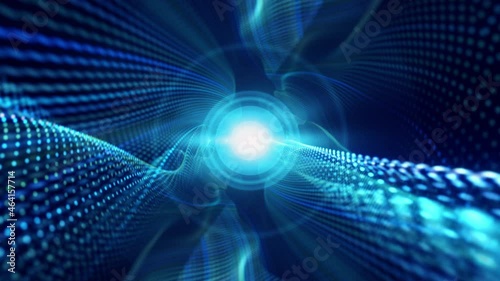 Wall mural abstract blue wire mesh dots with center flare light space background, geometry surfaces wave lines
