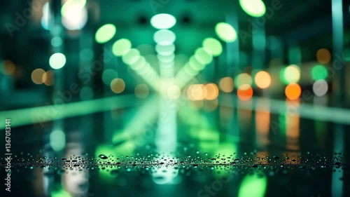 Wall mural : Abstract blurred green lights with bokeh effect on wet surface