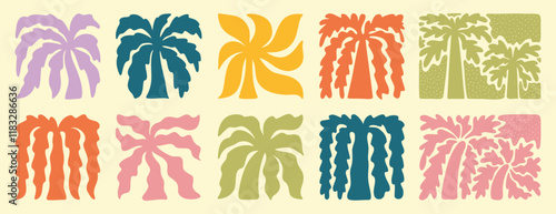 Wall mural abstract boho palm tree tropical art set. retro groovy wavy summer palms. vector square tropical ico