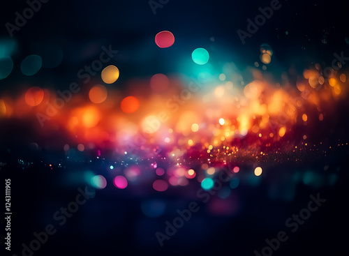 The watermark will not be included on Wall mural.: Abstract bokeh lights create a vibrant and dreamy background with a mix of warm and cool tones again