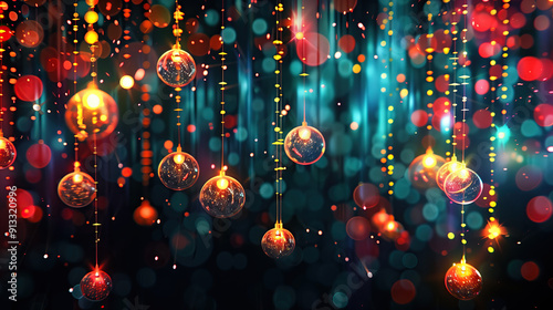 The watermark will not be included on Wall mural.: Abstract christmas light and balls design hanging on black background - -