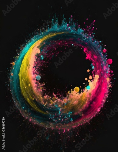 Wall mural abstract circle liquid motion flow explosion. curved wave colorful pattern with paint drops on black - Wall murals Wall mural abstract circle liquid motion flow explosion. curved wave colorful pattern with paint drops on black - Wall murals