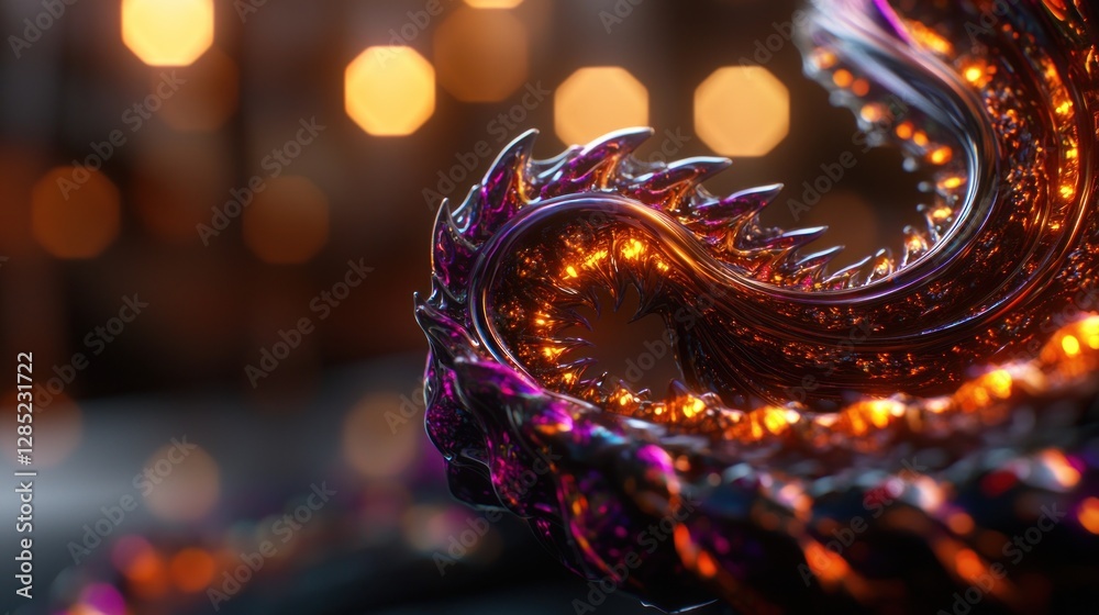 The watermark will not be included on Wall mural.: Abstract close-up of a colorful, illuminated spiral structure with glowing elements and blurred back