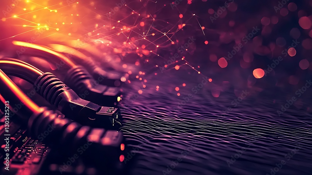Wall mural : Abstract close-up of network cables with vibrant lights and digital effects in a tech environment
