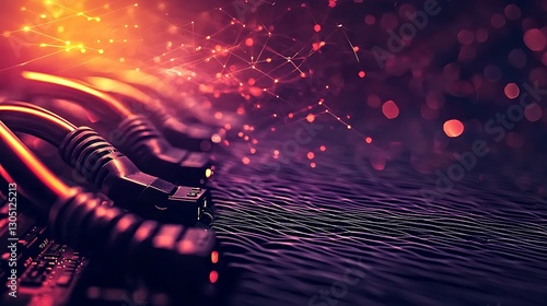 Wall mural abstract close-up of network cables with vibrant lights and digital effects in a tech environment - Wall murals Wall mural abstract close-up of network cables with vibrant lights and digital effects in a tech environment - Wall murals