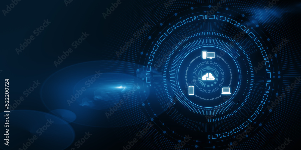 Wall mural : Abstract cloud hologram on blurry dark backdrop - cloud computing, big data backup concept - 3d render