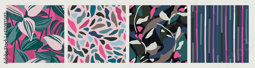 Abstract collection of seamless patterns with leaves and geometric shapes - modern designWall mural