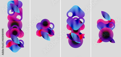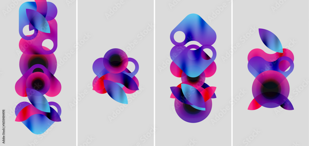 Wall mural abstract colorful shapes overlap, creating vibrant compositions. four panels display fluid forms, gr