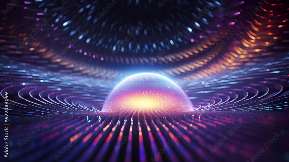Wall mural : Abstract colorful spectrum background with waves and 3d glowing glass shapes as abstraction backdrop