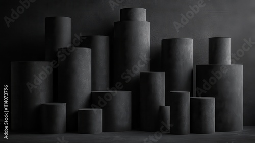 The watermark will not be included on Wall mural.: Abstract composition of dark cylindrical objects layered on a muted black surface in a minimalist st