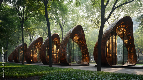 Wall mural abstract copper structures in a park setting architectural design and environmental art