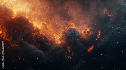 Wall mural : Abstract cosmic nebula with fiery orange and black clouds and sparkling particles -