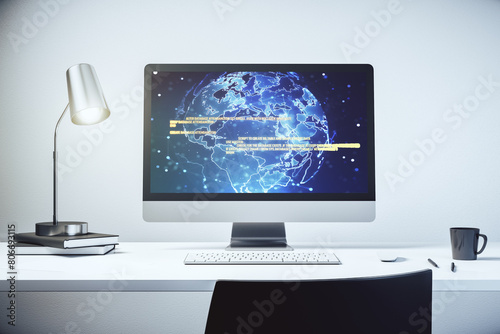 Abstract creative coding illustration with world map on modern computer monitor, international softwWall mural