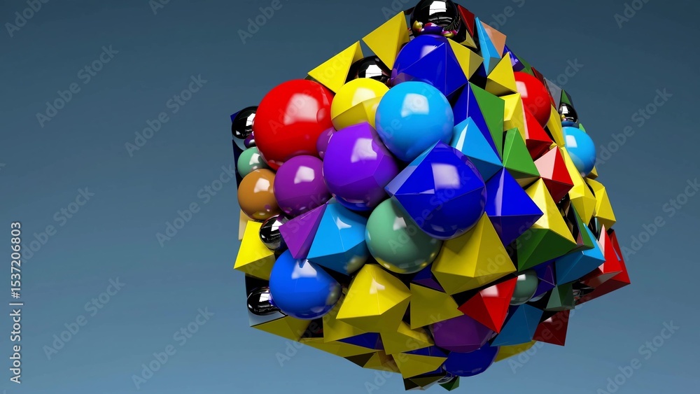 The watermark will not be included on Wall mural.: Abstract cube structure forming with colorful spheres and pyramids, symbolizing creativity, design,